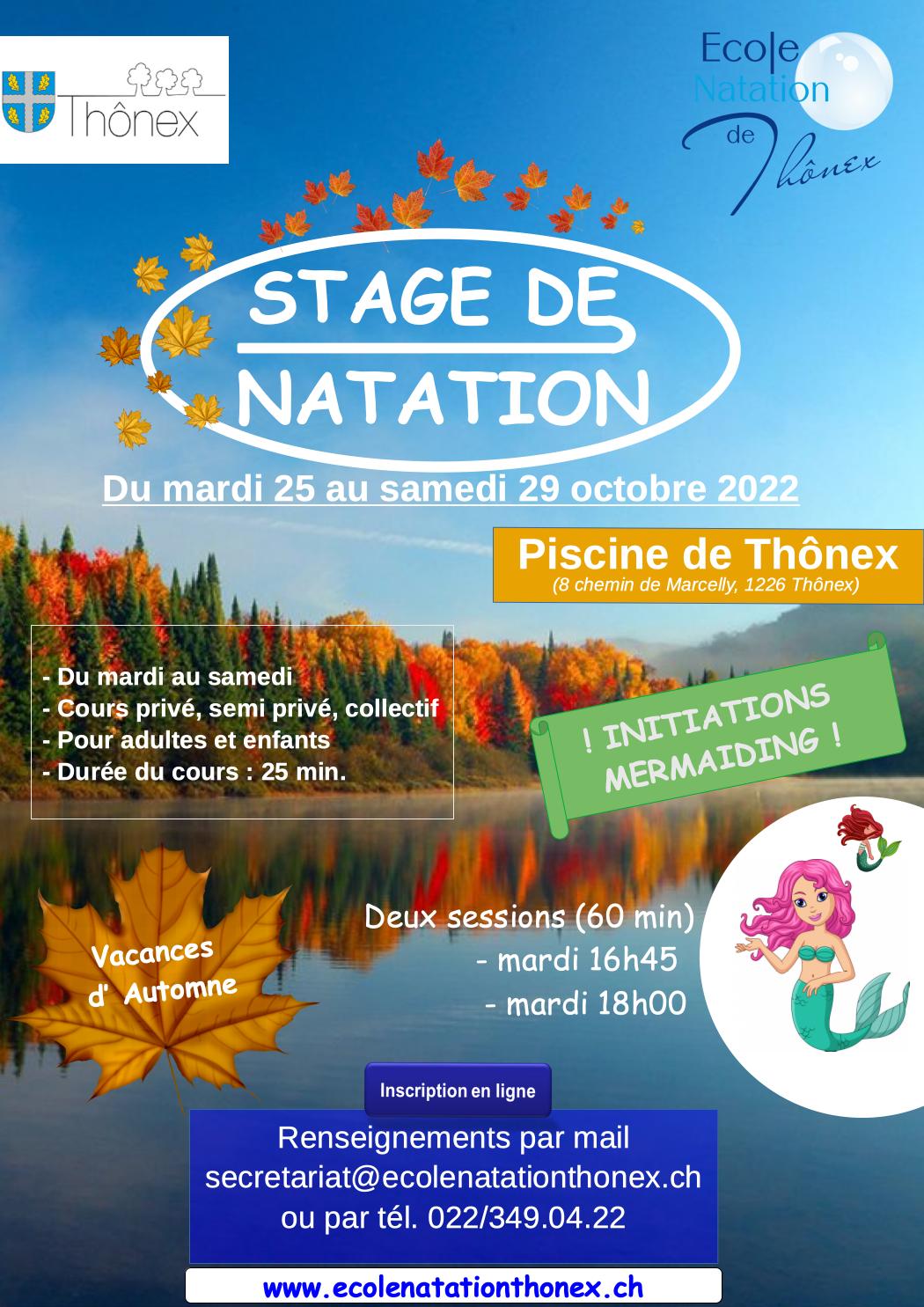 Vous trouverez tous les détails dans notre document complet (tarifs, horaires, CG, niveau, etc) : Stage Automne 2022 - stage de natation/mermainding ( inc: C.G.).pdf