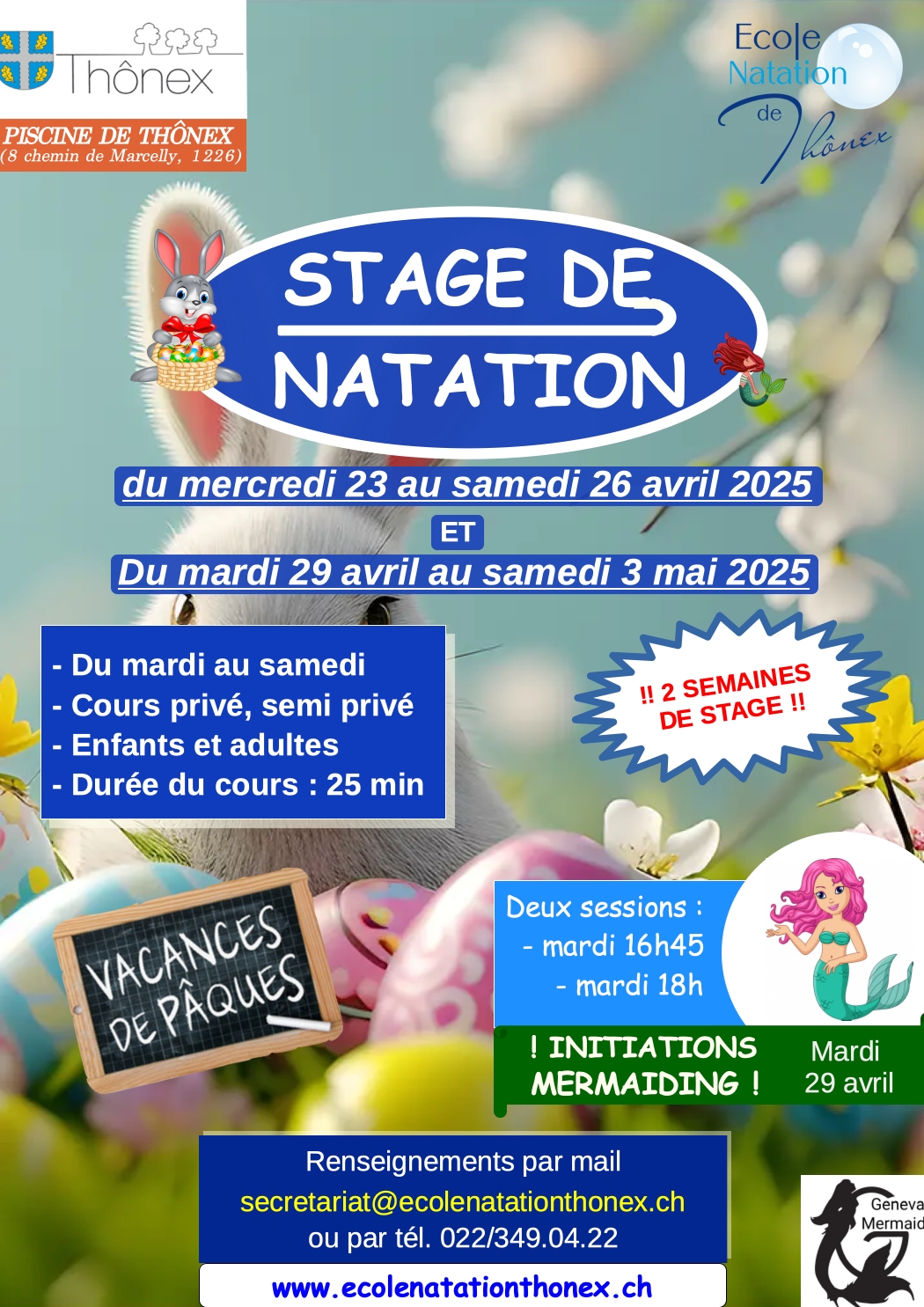 Vous trouverez tous les détails dans notre document (tarifs, horaires, CG, niveau, etc) : Stage Pâques 2025 - natation/mermaiding (inc: C.G).pdf